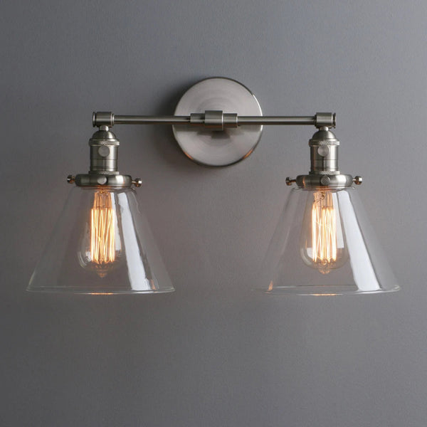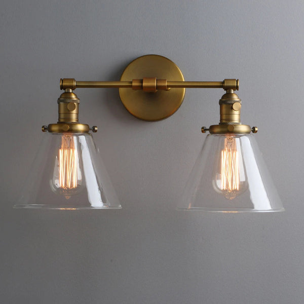 Featuring two clear glass cone shades mounted on a sleek brass-finished frame, this wall sconce exudes style and functionality. The exposed Edison-style bulbs provide a warm, inviting glow, making it a perfect addition to bathrooms, bedrooms, dining areas, or hallways.