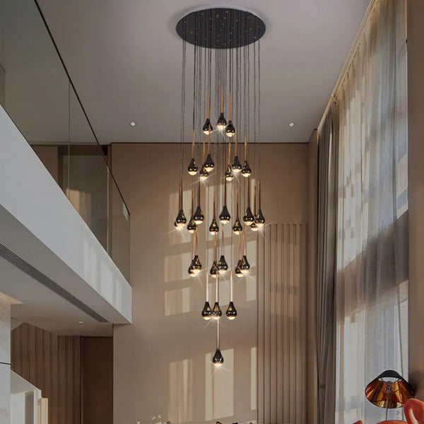 Elevate your space with the Duplex Staircase Chandelier, a stunning combination of design and functionality tailored for high ceilings and grand interiors. Featuring a round-like ball canopy with pendants that cascade downward, this staircase chandelier is perfect for creating a striking focal point in your foyer, staircase, or other large, open areas.