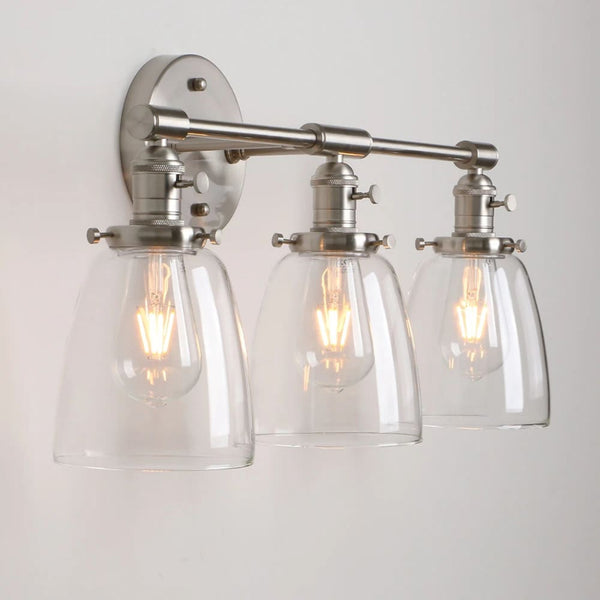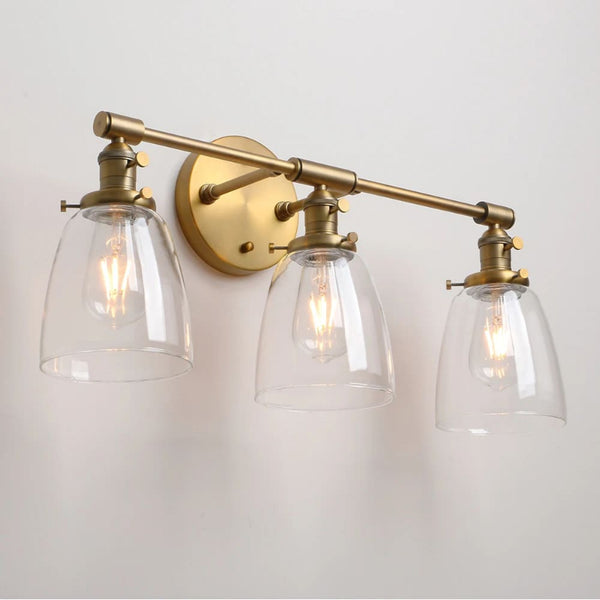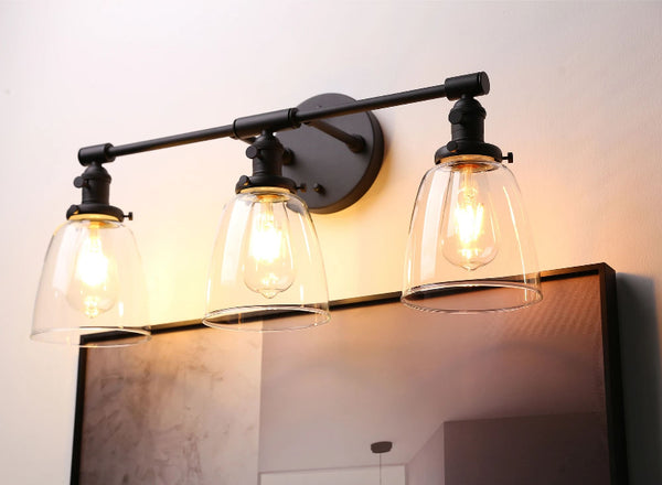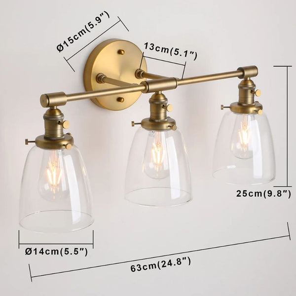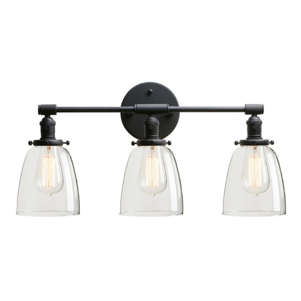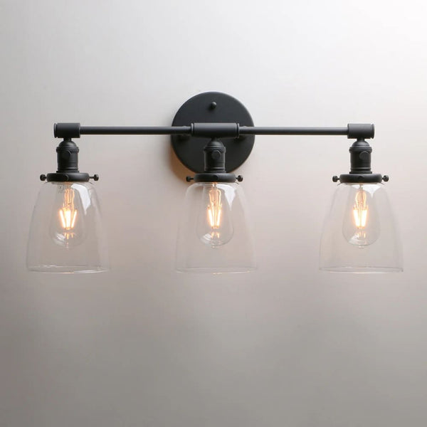 Enhance your space with this Hori 3 Light Wall Sconce, featuring clear glass shades and a sleek black finish. Featuring a sleek black, gold and chrome metal frame and clear glass shades, this three-light fixture exudes industrial elegance while providing ample illumination. Its versatile design is ideal for bathrooms, kitchens, hallways, or living areas, enhancing both residential and commercial interiors.