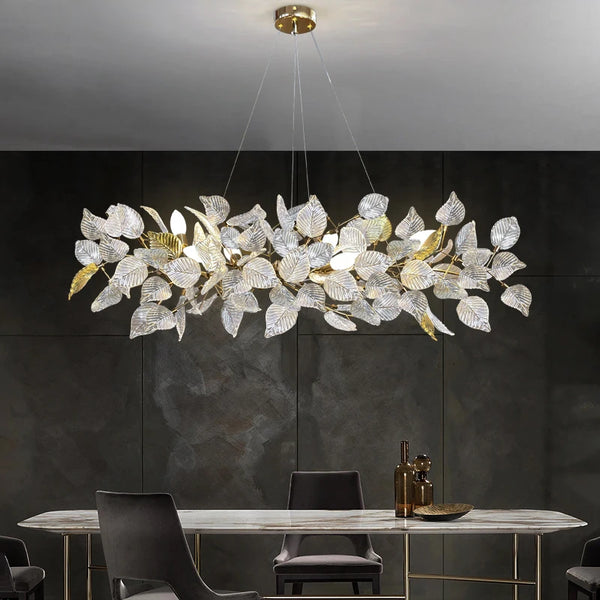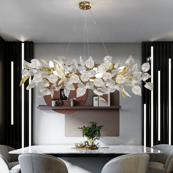 The Biloba luxury Leaf Chandelier, a masterpiece inspired by the graceful biloba leaf. This chandelier features intricately glazed leaves that shimmer beautifully under its warm glow, creating a luxurious ambiance in any space. Perfect for living rooms, dining areas, or entryways, its elegant design blends nature-inspired aesthetics with modern sophistication